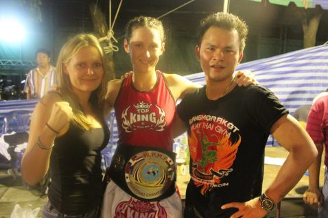 Theresa (pictured with her former trainer Lee Blackman) after winning her first world title in Bangkok (WPMF 130lb), King’s Birthday, 2008. Photo by Rob Cox