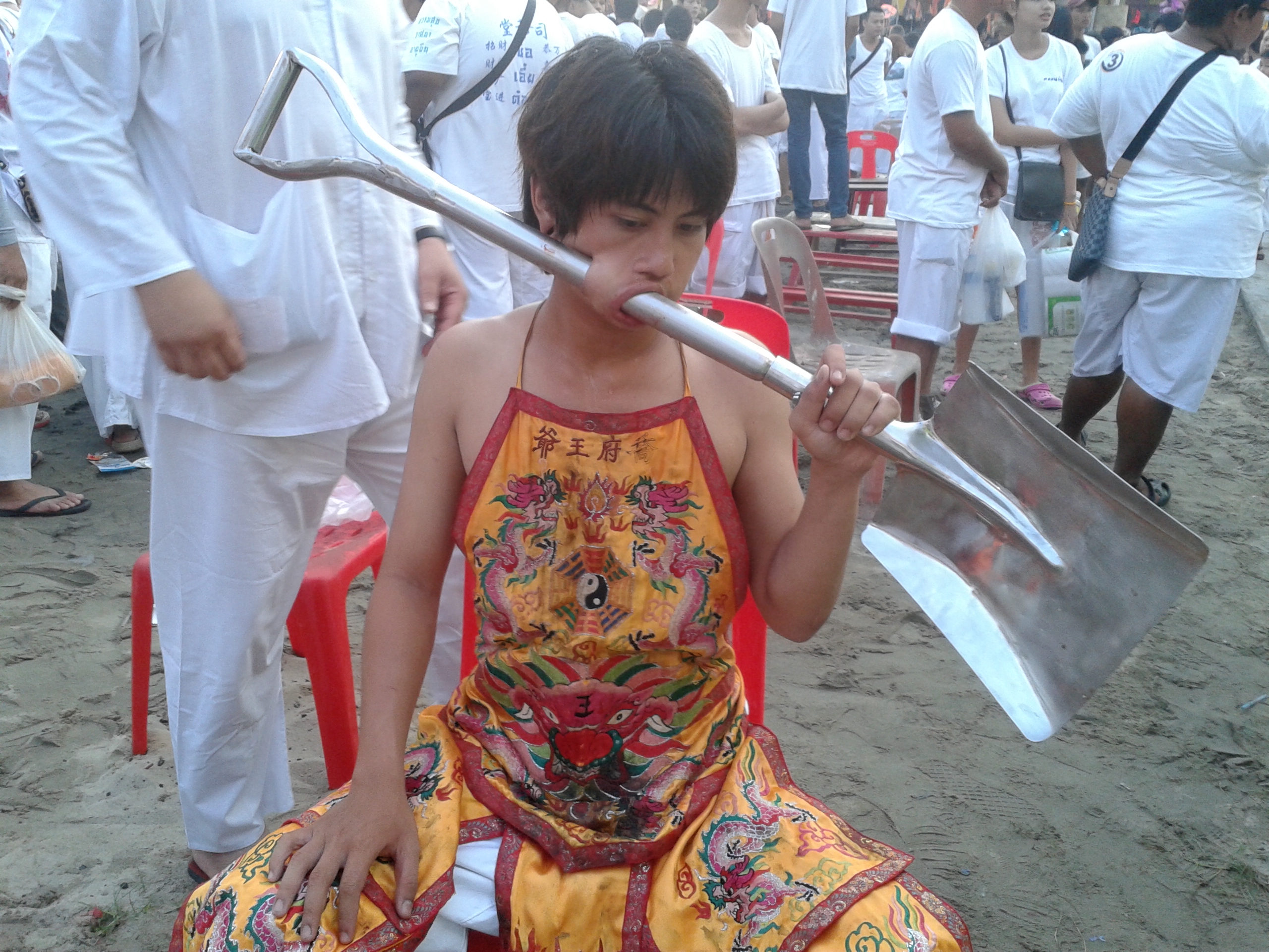 Two sights unsettled me during the festival. Although I barely flinched at the piercings, watching two mediums use the same long saw to lacerate their tongues until blood spilled down their chests made me queasy and uncomfortable.