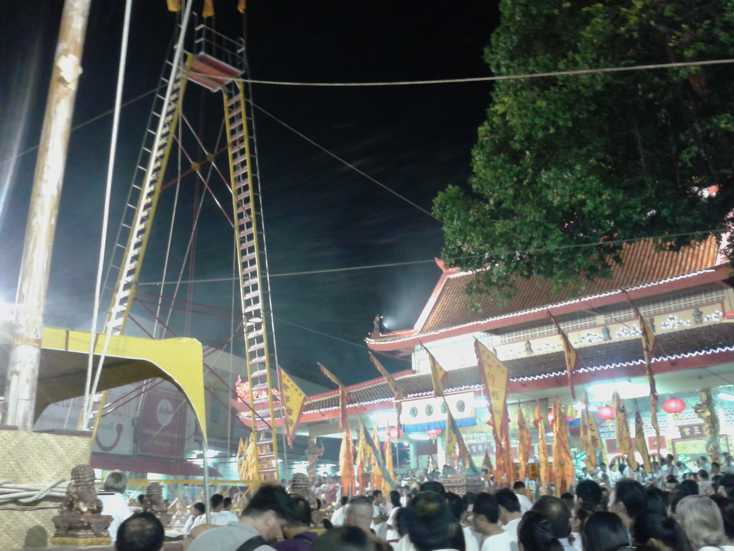 My final vegetarian festival experience was the bladed-ladder climbing ritual at Bang Neow Shrine. A tall structure consisting of two ladders with blades for rungs (demonstrations of fruit being chopped on the rungs proved their authenticity), connected by a small platform, had been erected in the shrine forecourt. The area was heaving with spectators—a far greater number than had attended the piercing ritual two days prior. The ceremony itself wasn’t actually very interesting, though an announcer did iterate that “it’s a ritual, not a performance”. Sequentially, the mediums emerged from the shrine, climbed up one ladder, threw small pieces of Chinese yellow cloth from the high platform, and then descended using the opposite ladder.