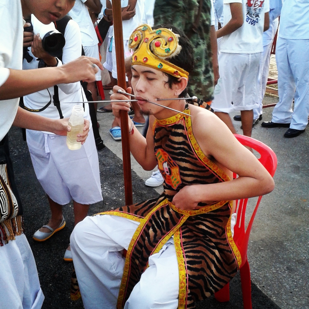 Phoney or not, the Phuket Vegetarian Festival is the most stimulating and interesting festival I’ve experienced in Thailand. If you are able to travel to Phuket within the upcoming 9 days, I definitely recommend attending the festivities, which will be held, this time, at Kathu and Cherng Talay shrines only. Go early to catch the piercings (before 6am if possible), be sure to watch the street processions, and enjoy the sensory overload.