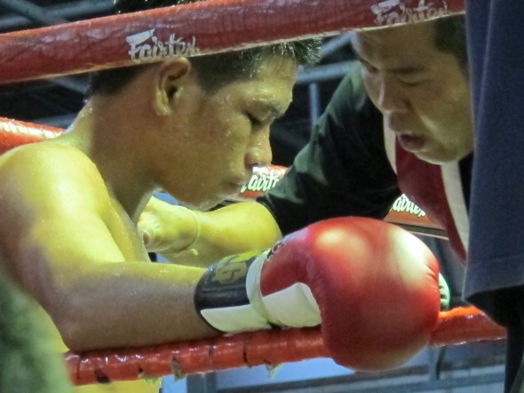 When browsing through photos on my computer for a potential Wordless Wednesday post, one seemed to leap out of my screen at me. It shows my former trainer Pet cornering fighter Pragaipet Eminent Air at Thepprasit Stadium in Pattaya, and was taken by my friend Huong Tran in 2011. Pet has been in my thoughts lately as the second anniversary of his death approaches, so it seems apt to use a photo that includes him in my first ever Wordless Wednesday post, shown below.